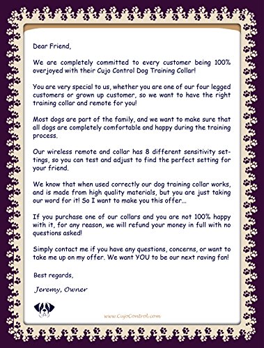 - WHEN YOU ORDER YOUR CUJO CONTROL DOG TRAINING COLLAR TODAY, you're protected by a lifetime, no questions asked money back guarantee and world class customer service!