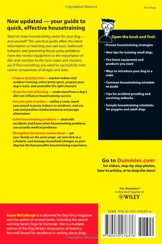 The most current information and tips on producing housetraining less complicated for your pet and yourselfDid you know that what you feed your dog can effect aid or hinder the housetraining procedure? That\'s just one particular of the beneficial ideas you may locate in Housetraining For Dummies 2nd Edition, the authoritative housetraining reference for new and veteran pet owners alike.This new edition characteristics lots of new and revised materials on every little thing from the latest housetraining gear to the most recent data on diet and nutrition and the critical function it plays in housetraining. You are going to also find useful ideas and strategies for producing environmentally secure cleaners from natural merchandise identified in the home and choices you can use if you have a sensitive pet.Functions the most current findings on how pet nutrition can influence housetraining successOffers proven housetraining strategiesIntroduces new strategies for housetraining a number of pets at onceReviews new housetraining products and productsShows you how to make environmentally safe stain and odor removers from merchandise presently in your homeSusan McCullough is a columnist for Canine Fancy magazine and the writer of numerous books such as Beagles For Dummies and the award-winning Senior Canines For DummiesHousetraining can be a hard and nerve-racking process for each you and your puppy, grownup, or senior dog. Housetraining For Dummies 2nd Edition is the resource you want to make it more rapidly and less difficult for both of you.