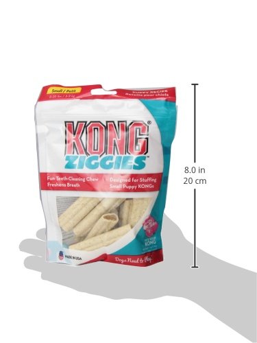 Kong Ziggies are healthful canine treats made for stuffing inside small Kong interactive toys. For grownup dogs, these hugely digestible treats work to help to freshen breath and clean teeth. Made in the USA.