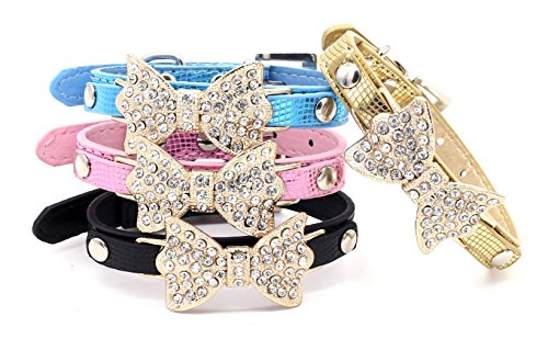 Let Your Dog/Cat Stand Out With This Formal Bow Tie Collar Adjustable Velcro Closure Bow tie canine collar dimension: XS neck dimension seven.9\" - 10.2\", broad .6\", complete length 12\" S neck dimension ten.six\" - 13\", wide .six\", total length 14.six\" Bling Rhinestone Pet Cat Dog collars with bows come in Pink,Blue,Black and Golden Wonderful pet collar with butterfly form bow tie style, perfect for celebration costume, wedding ceremony & holiday gifts. Perfect for weddings, holidays and events.