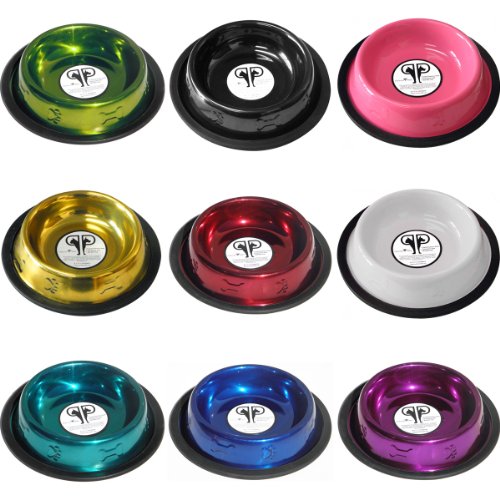 The Platinum Pets Stainless Steel Embossed Non-Tip Puppy Bowl\'s unique design will add color to your pup\'s meal every day. The stainless steel bowl is tastefully embossed with paws. Available in a multitude of colors, the bowl is powder coated in a FDA compliant and dishwasher-safe finish. The powder coated finish adds extra strength against wear and tear and weather and a lifetime guarantee against rust. Each bowl comes with a durable rubber base designed to prevent spills and tipping by your hungry dog. Bowls are measured in fluid ounces and are rounded up to quart sizes.