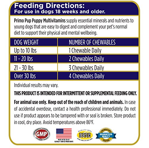 Veterinarian Developed Therapeutic Support -Veterinarian formulated & recommended. -Formulated particularly for the puppy life stage to help all round physical and mental wellbeing. -Full multi-vitamin/mineral formula guarantees dog\'s diet includes sufficient nutrition in an straightforward to digest formula. -Supplements vitamins & nutrients lost in canine meals manufacturing & those absent from raw food diet plans. Quality & Purity Assured Simply because we care about what you feed your pet as much as you do, all of our items and components are extensively tested for security and purity before, for the duration of and soon after the manufacturing method. -a hundred% human grade substances -a hundred% grain totally free -No artificial colours or flavors -Made in the USA -Produced with Licensed Good Manufacturing Practices -Lab examined for good quality and purity -Carries NASC Seal of Approval Benefits of Puppy Multi Formula As in individuals, the rewards of supplementation has been well documented in pets. Accounting for deficiencies in important nutritional vitamins & nutrients helps to preserve general wellness & assists to hold our pets in peak condition. Primo Pup Multivitamins are easy to digest & compliment your pet\'s regular diet to assistance their bodily & psychological wellbeing. Primo Pup Multivitamins are veterinarian formulated to supply an optimum blend of essential minerals & nutrients proper to a pet\'s lifestyle stage from puppy to grownup to senior. Consists of 60 super tasty liver taste chewables.