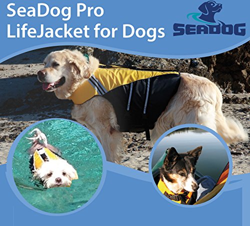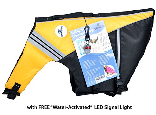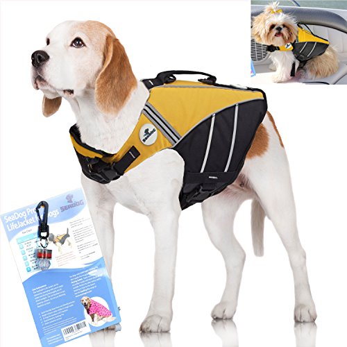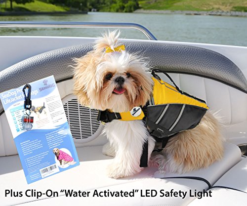 SeaDog Pro Dog Life Jacket (M) with Clip-On Water Activated LED Safety Strobe – Quick Release Doggy Life Preserver – High Quality Adjustable Pet Life Vest. Tough Hi-Vis Nylon – Reflective Trim, Strong Grab Handle -Best Dog Flotation Vest on Amazon
