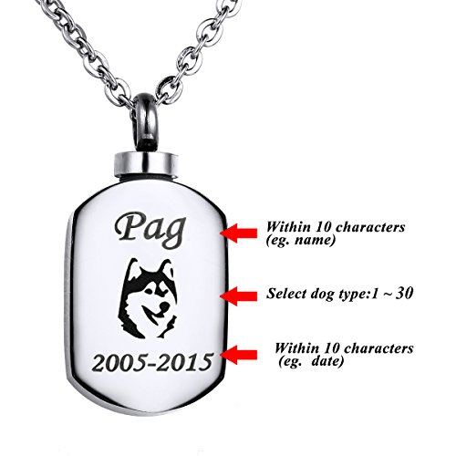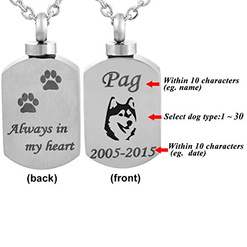 - IMPORTANT!! Choose and tell us the pet dog from 1-30 at the third picture. Then Click CUSTOMIZE NOW to add your personalization details to this pendant,You may include 2 lines of text for name and date on front surface.The back surface has two pet paw and 'Always in my heart'. Add to cart ONLY AFTER you have completed back surface with your information.